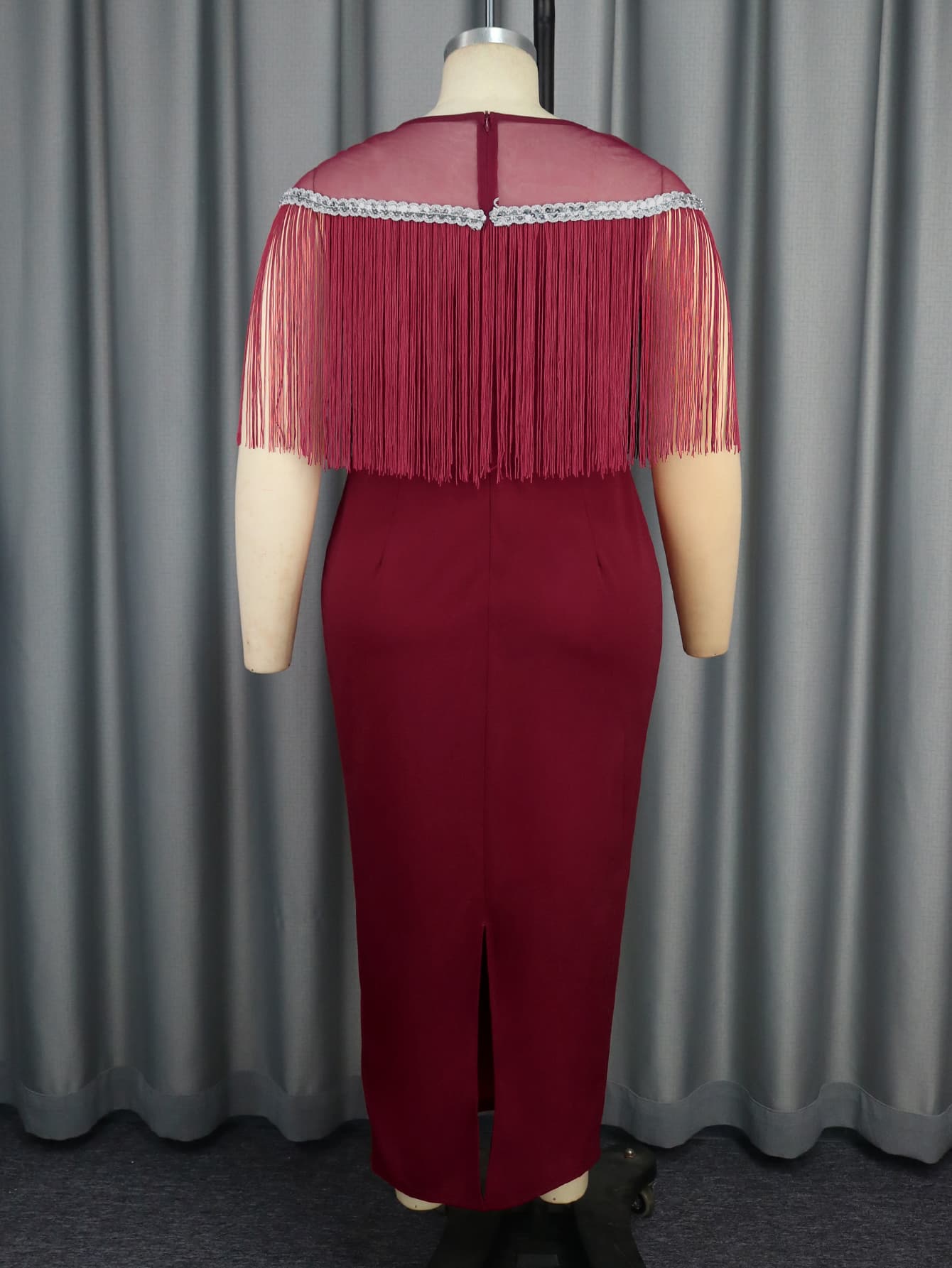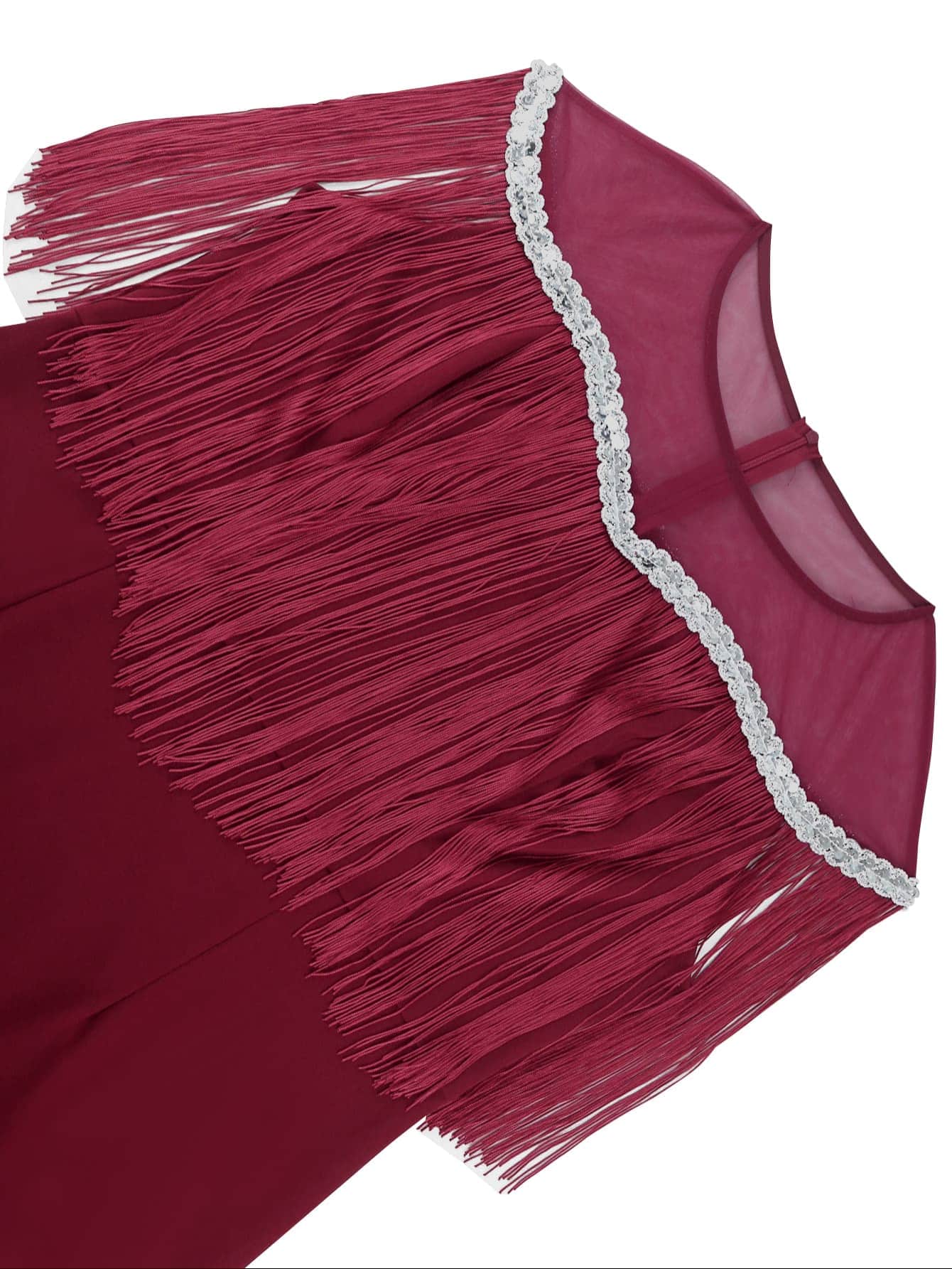 Elevate your party wardrobe with our Burgundy Fringe Embellished Bodycon Dress. This stunning dress features chic fringe detailing along the shoulders, adding a touch of glamour and movement to your look. The bodycon fit accentuates your curves while providing a sleek, streamlined silhouette that exudes confidence and sophistication.