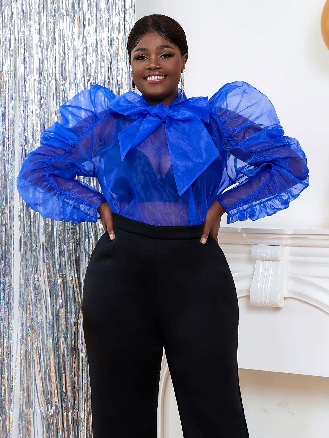 Bowtie Sexy See Through Long Sleeve Loose Evening Party Pullover Shirts Blouses.